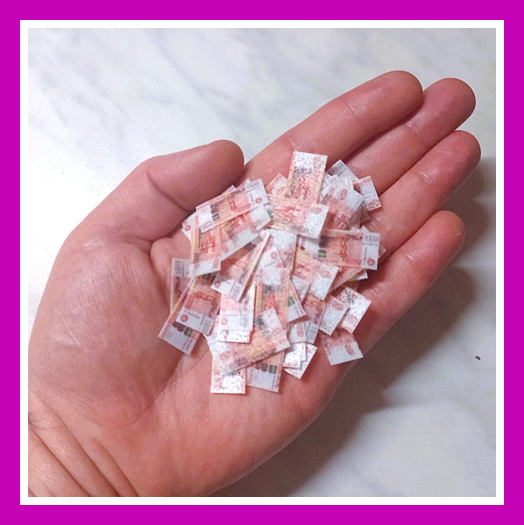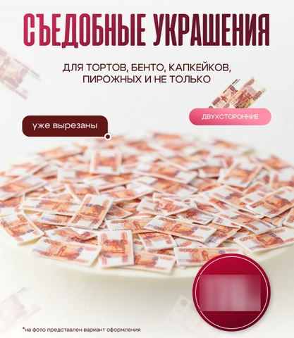 Съедобные украшения для торта из вафельной бумаги, денежная "вафельная" посыпка для тортов, капкейков, пряников, пирожных "Микро-денежки 5000р". Размер - 2.5*1 см. Количество - 160 шт. Купюры - двусторонние (обратная сторона тоже окрашена). Толщина бумаги - 0.3 мм. Цвет: Дизайн Рубли России. Вкус - нейтральный.